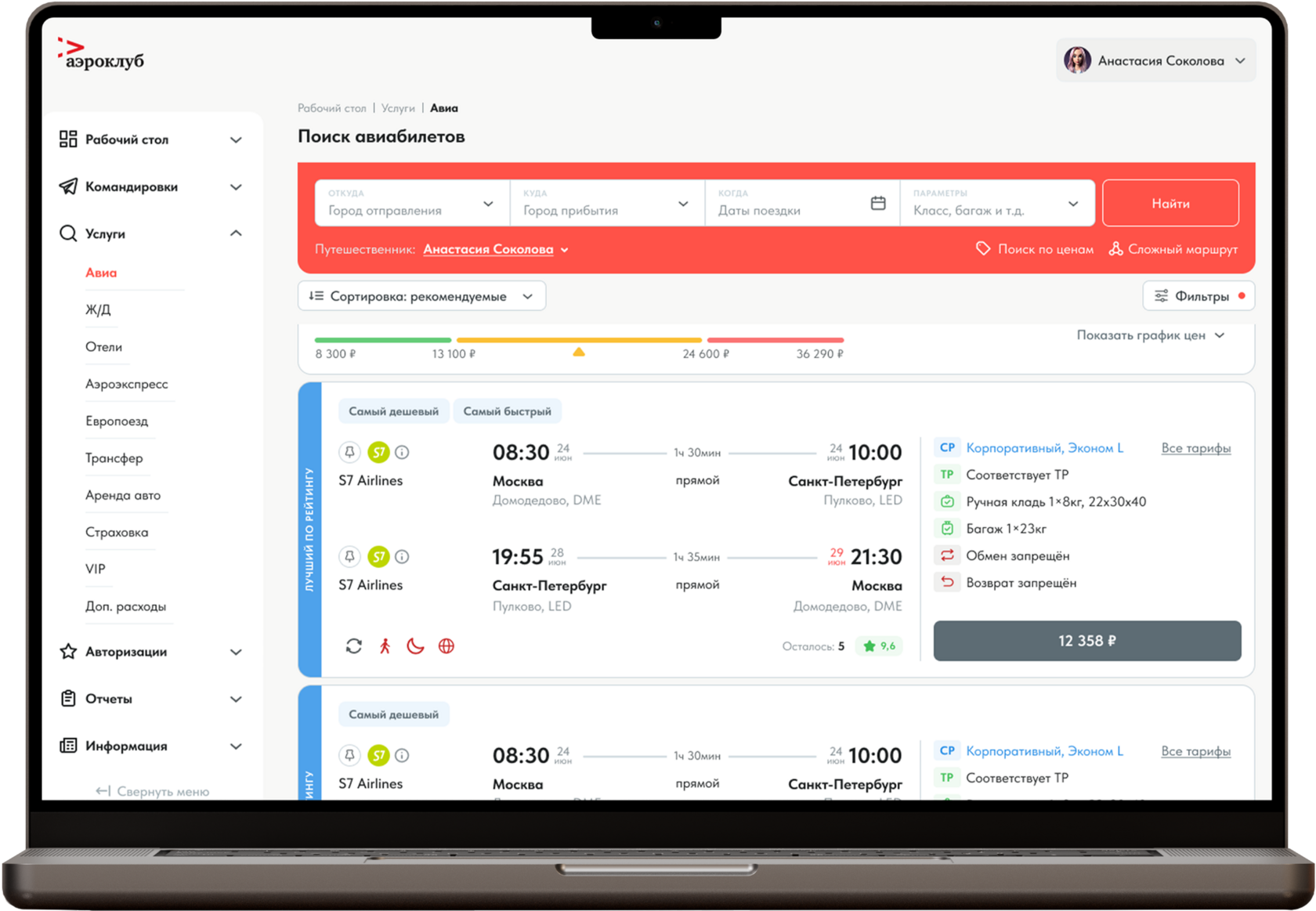 Мгновенное отображение средней стоимости и подходящих тарифов. Система предложит все альтернативные варианты с учетом корпоративных ограничений